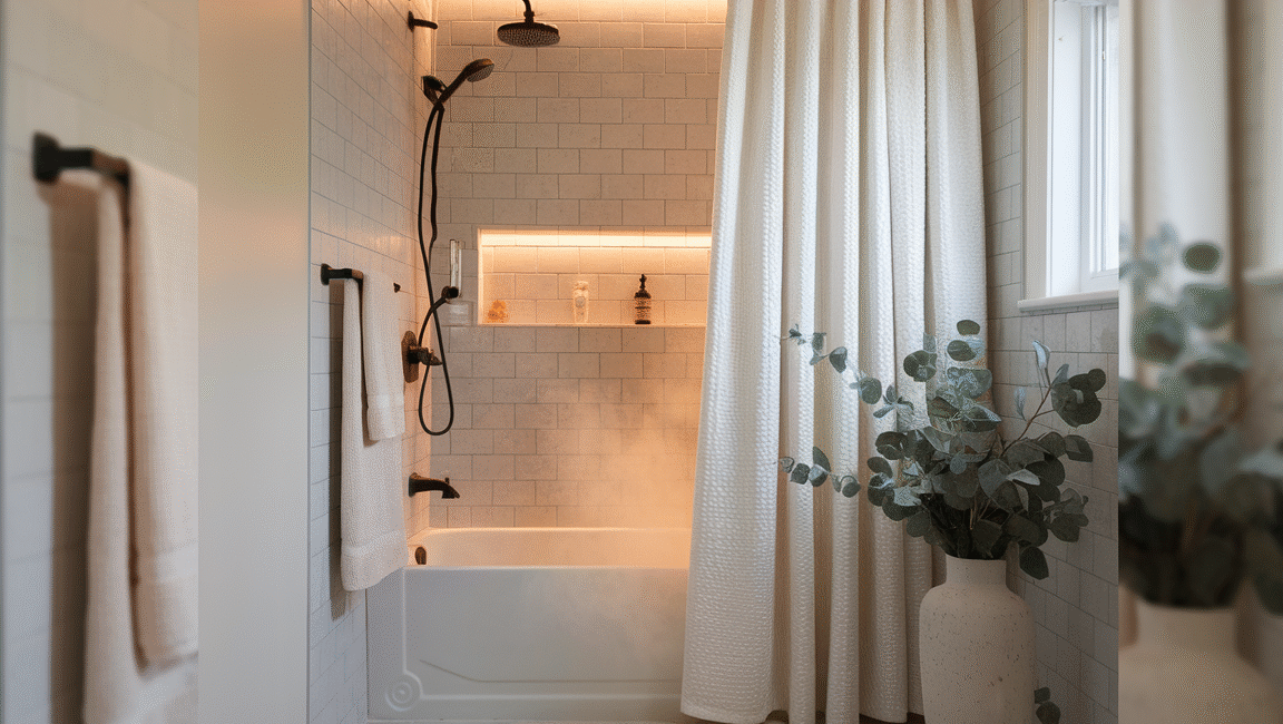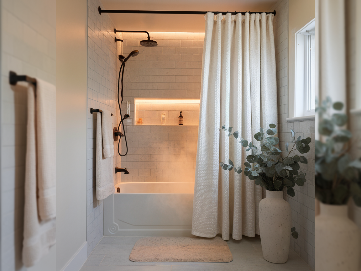 I like to think of a floor-length curtain as a gentle hug for your shower. It blocks drafts, traps steam, and makes a compact bathroom feel taller.