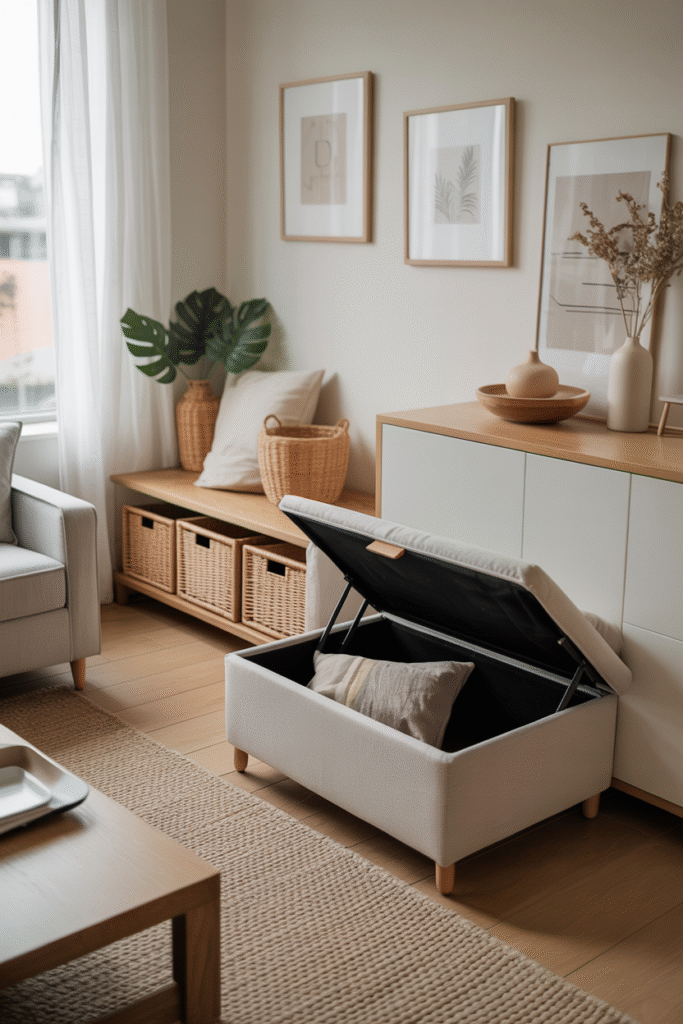 Let’s be honest — small living rooms can quickly turn into clutter traps. The secret to keeping them serene? Hidden storage that blends with your decor.