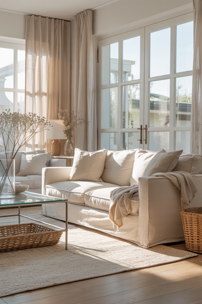 Start with soft neutrals — think warm whites, gentle grays, or sandy beiges — and then add subtle contrast through materials. Maybe a linen sofa, a wood coffee table, and a woven rug.