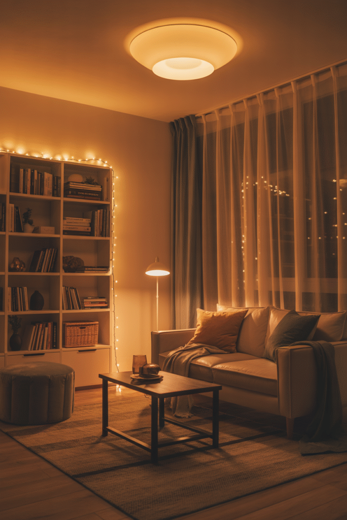 - Accent lighting: String lights, LED strips, or wall sconces for cozy evening vibes.