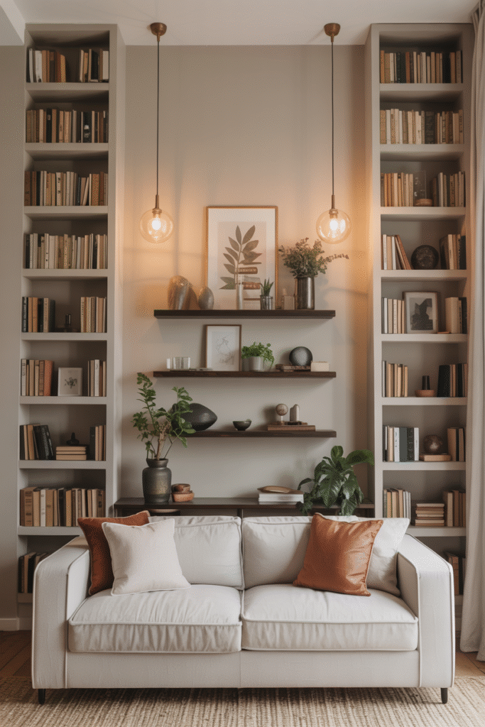 - Tall, narrow shelving units that stretch to the ceiling — they visually elongate the room.