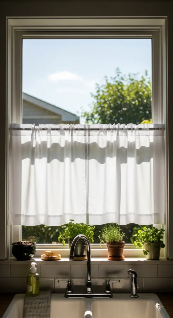 Café-style drapes instantly cozy up a kitchen without stealing the sunshine you rely on to stay awake while rinsing breakfast bowls. They cover just the lower half of the window, which gives you privacy from curious neighbors but still lets natural light pour through the top. If your sink faces a less-than-glamorous view, these drapes soften it just enough to make dish duty feel less like a chore.