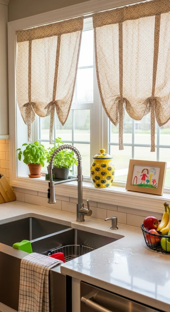 Performance fabrics make kitchen drapes feel far less precious, especially in the splash zone around a busy sink. These materials shrug off drips, splatters, and the occasional overenthusiastic “helping” from kids. You get the softness of fabric without the stress of constant stain patrol. It’s a practical upgrade that keeps your window looking crisp even on days when the countertop clearly gave up hours ago.