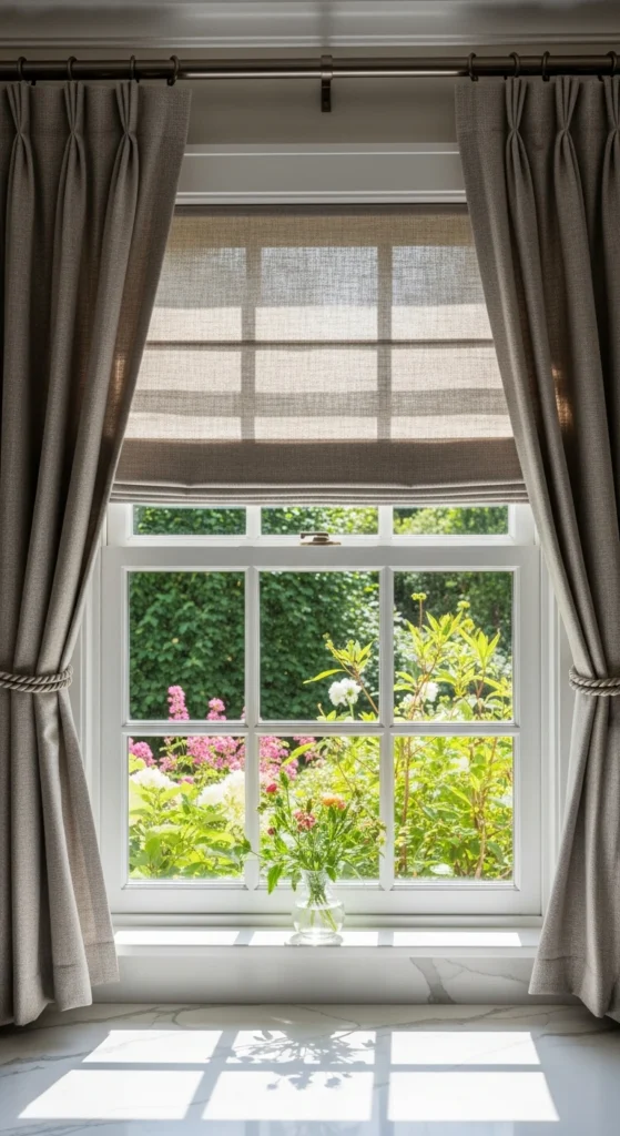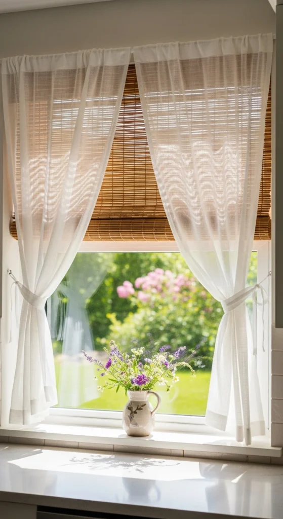 Layering sheer drapes over woven shades brings both softness and structure to a kitchen window. The shades handle the practical tasks—blocking glare, adding privacy—while the sheers filter the light into something calm and inviting. It’s a combination that works in almost any style of kitchen. The woven texture keeps the space warm, and the sheers keep everything feeling bright and breezy.