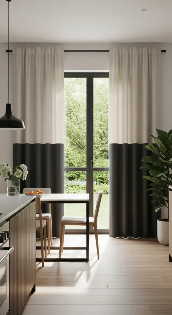 Color-block drapes make an open kitchen feel more grounded without adding visual clutter. The darker lower section steadies the room, while the lighter top keeps everything bright. It’s a simple trick that quietly defines the kitchen area—almost like drawing a soft boundary line with fabric instead of walls. If your layout feels a little “floating,” these panels give it just enough structure to feel intentional.