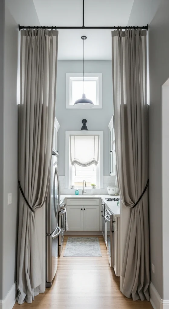 Ceiling-Mounted Drapes to Stretch a Small Kitchen