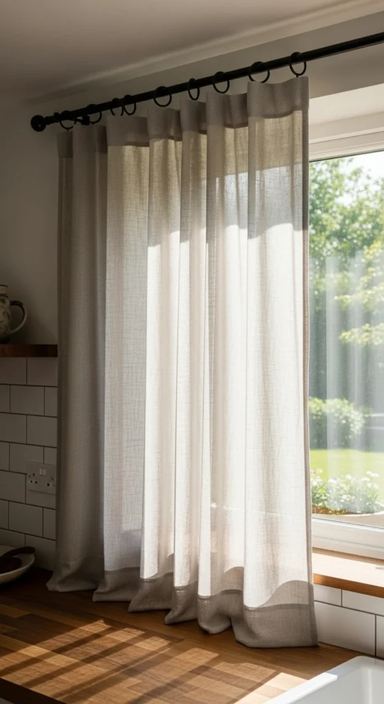 Textured linen drapes bring an easy, lived-in elegance to a kitchen, especially when paired with striking hardware. A bold black or warm brass rod instantly sharpens the look, almost like adding jewelry to the room. The soft weave of the linen keeps everything relaxed while the hardware adds structure. If your kitchen leans minimalist, this combo introduces warmth without overwhelming the palette.