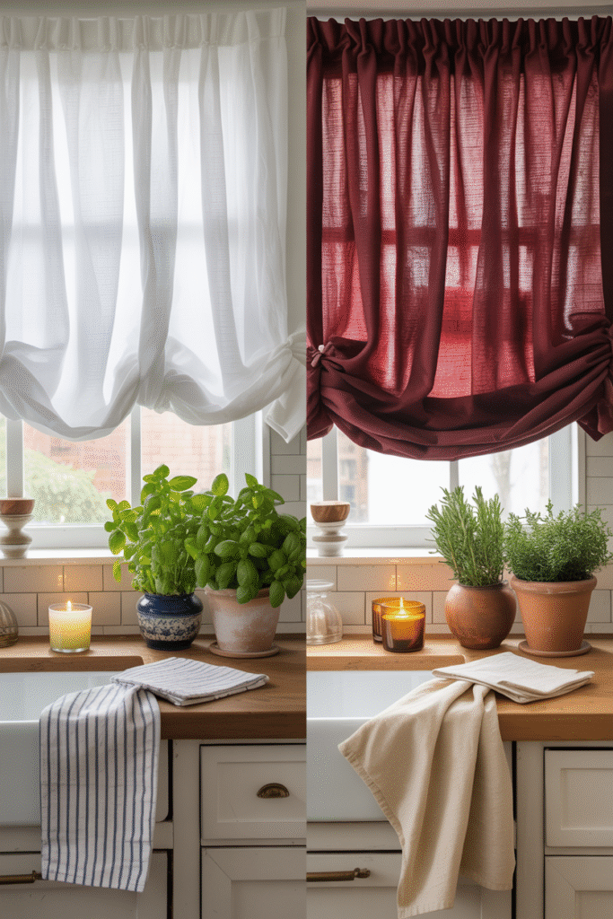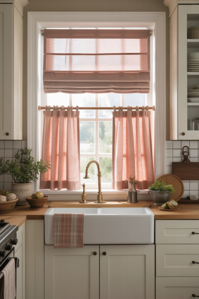 Textiles instantly soften a small kitchen. Café curtains let light pour in while maintaining privacy.