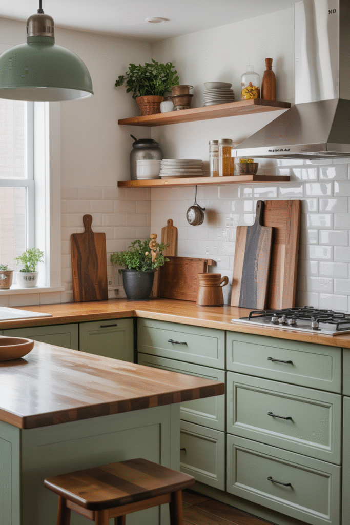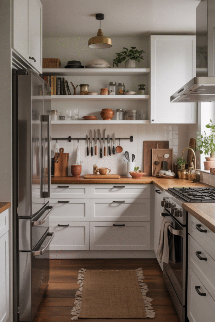 Wood instantly softens a kitchen full of hard materials. Even one surface—like a butcher-block island top or open shelf—adds warmth.