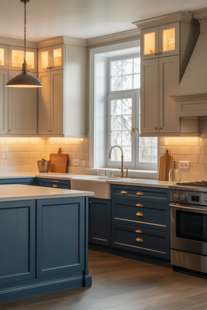 - Lower cabinets: dark tones like ink, olive, cocoa, or navy.