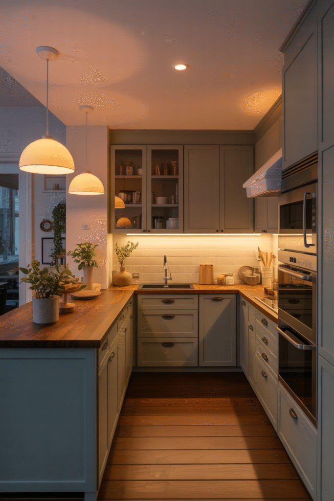 Pro tip: Place a small LED lamp (never incandescent) on a safe countertop corner to create instant warmth in a galley kitchen.