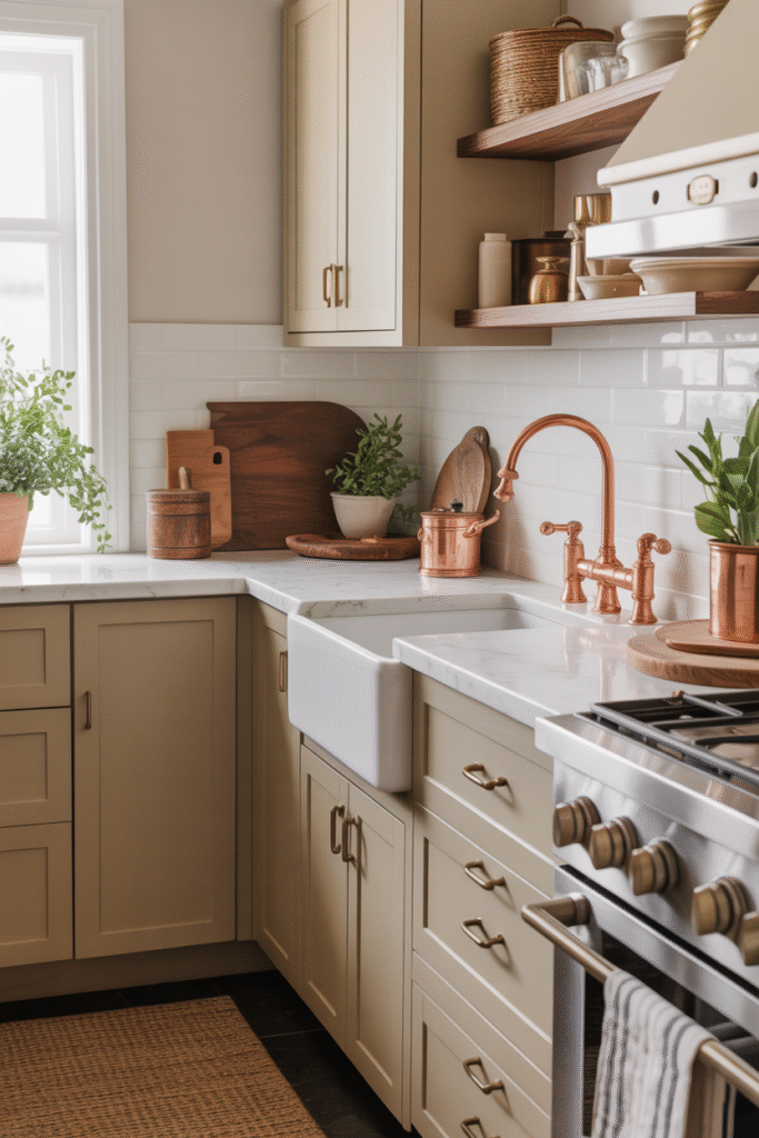 If you rent or can’t replace flooring, add terracotta pots, clay utensil holders, or rust-toned dishware to bring that cozy hue in.