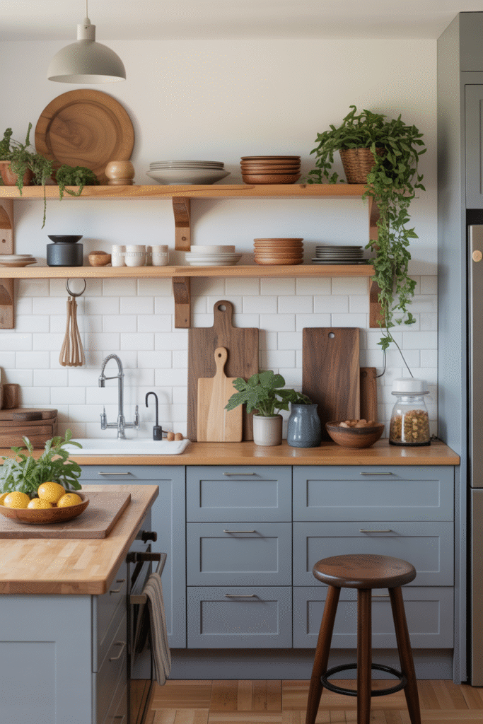 If your kitchen leans white or gray, layer in wood tones—think open shelves, cutting boards, or a stool seat.