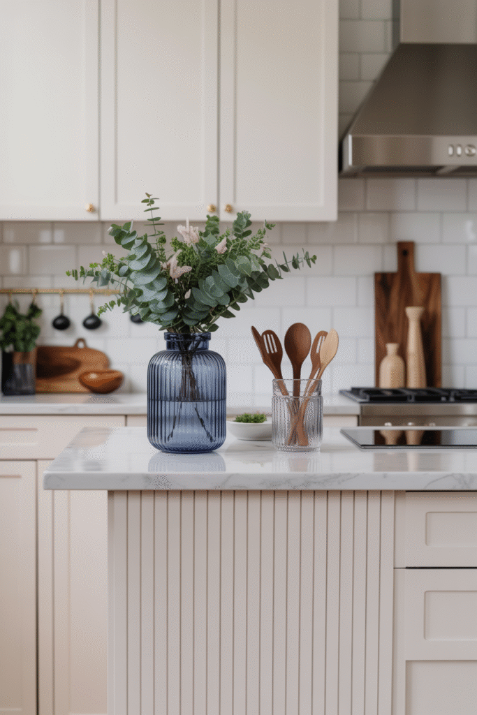 The fluted trend is here to stay—and small details go a long way. Add a ribbed glass vase, fluted utensil jar, or even peel-and-stick fluted panels on your island.