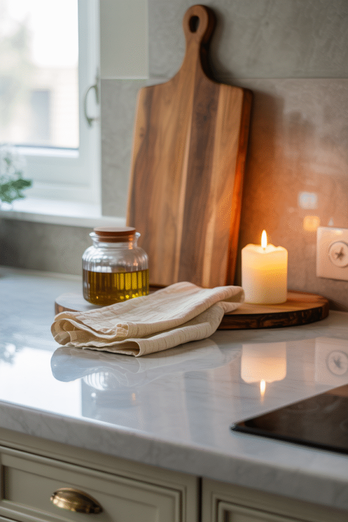 A tidy counter makes every finish shine. Remove unused appliances, then style a small vignette: cutting board, olive jar, linen towel, and a candle.