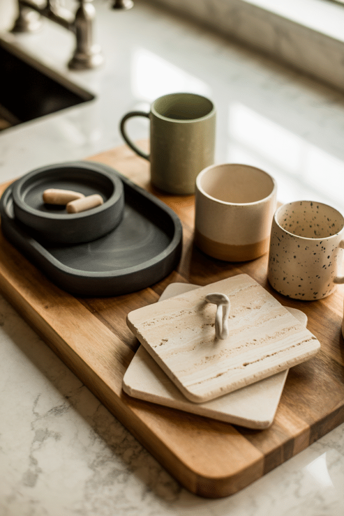 Matte stone trays, travertine coasters, or speckled ceramic mugs add organic texture and tone.
