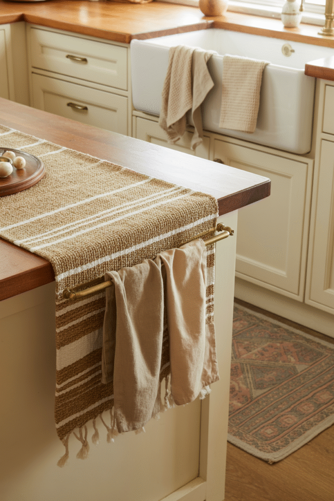 Swap out stiff towels and runners for woven linens, jute, or soft cotton. Look for subtle patterns (stripes, waffle textures) in beige or tan tones.