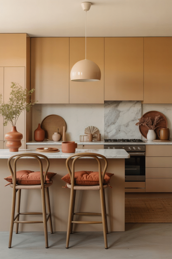 - 🎨 Use small accessories: vases, dish towels, or cushions on bar stools.