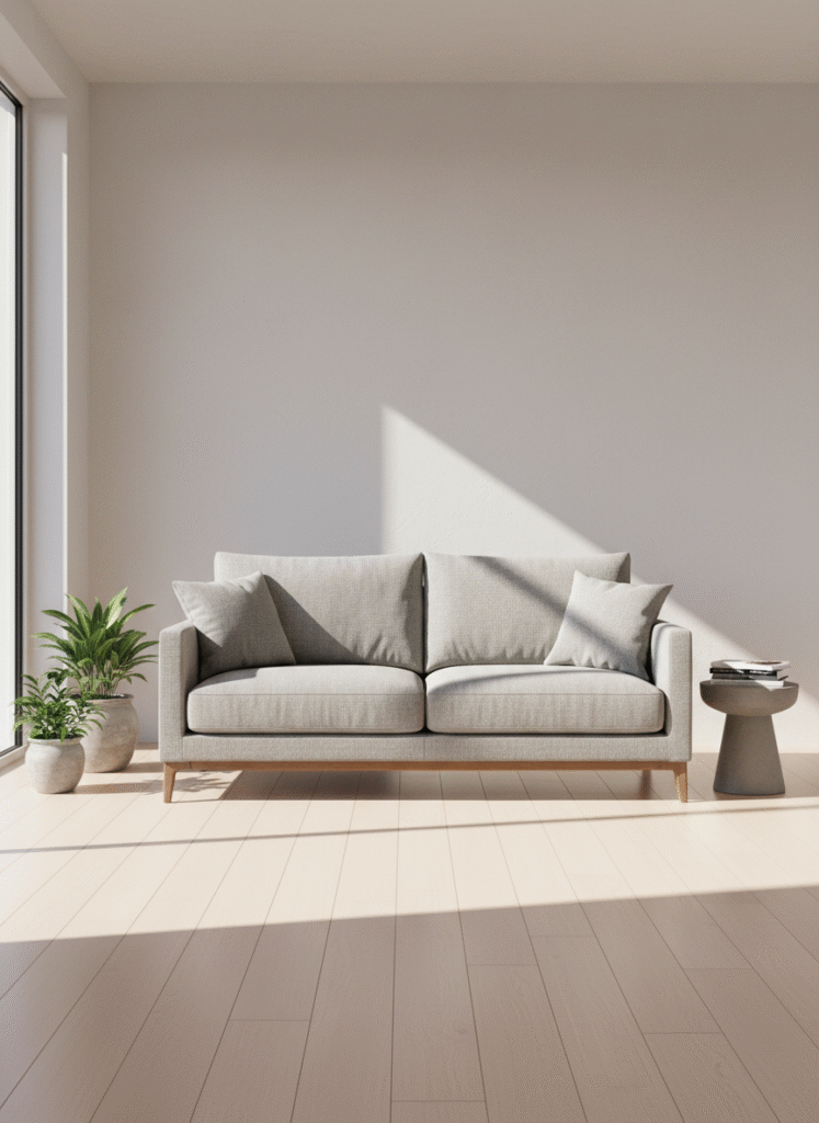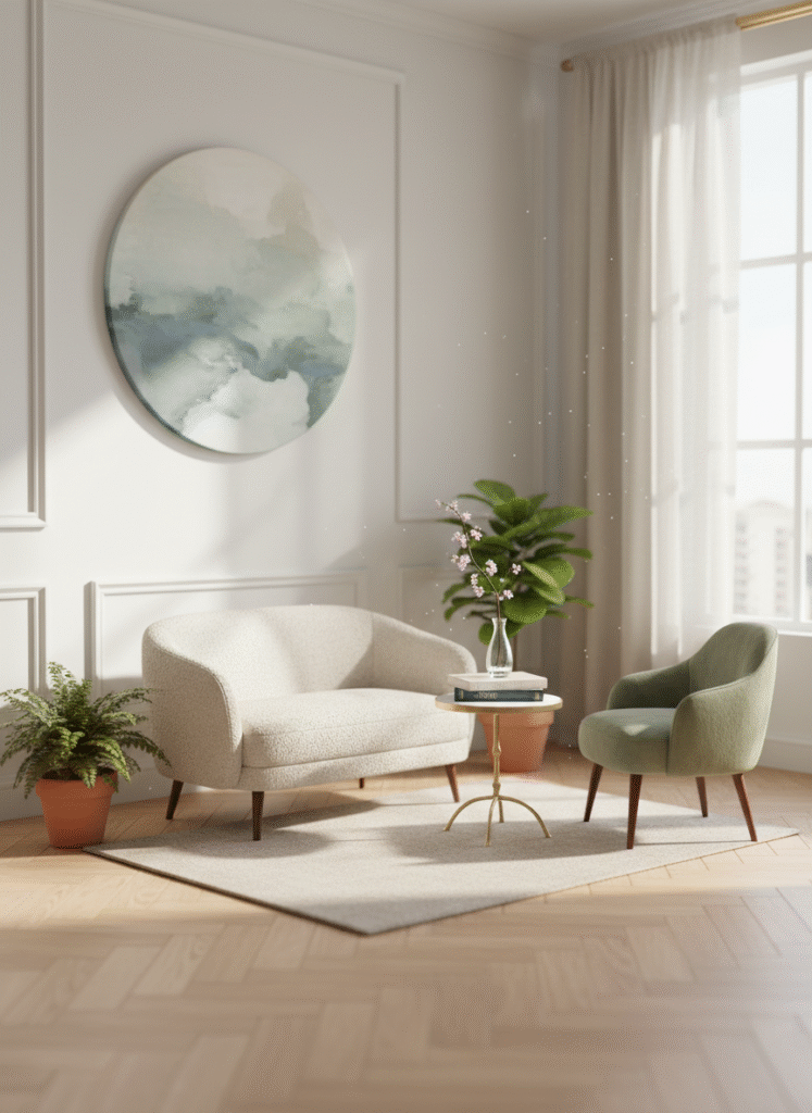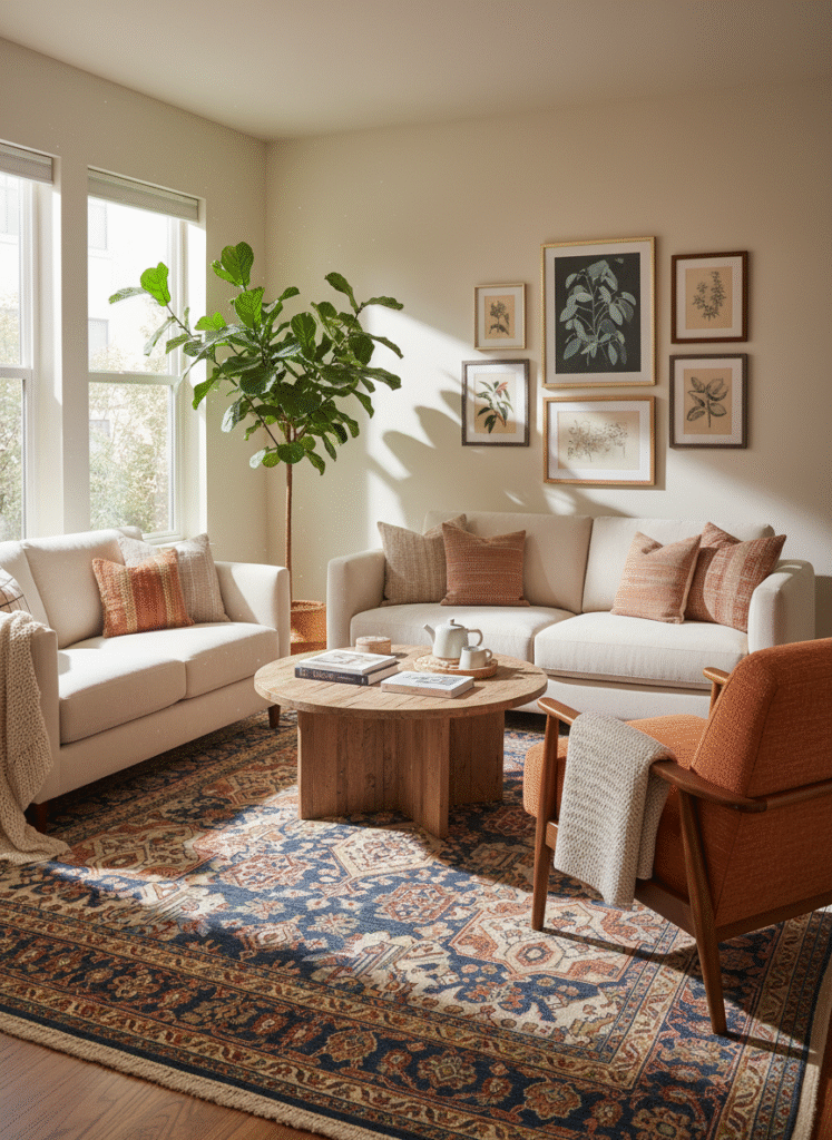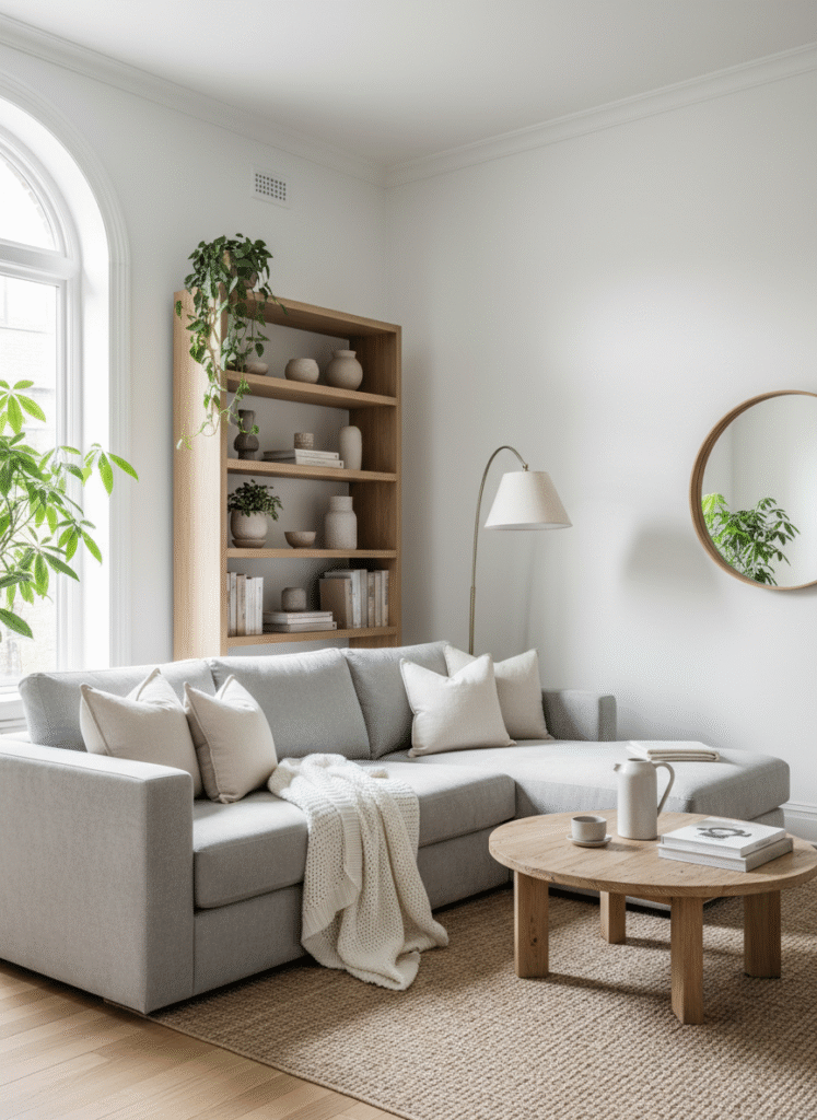 Pull your main seating (sofa or armchairs) slightly away from the walls. This creates a breathable gap that instantly makes the room feel less cramped and more intentional. Pair with a slim console table behind the sofa for extra surface area.