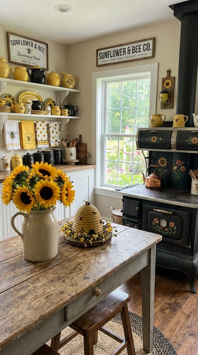 For personality, add Hand-painted Sunflower Kitchen Decor—like a small painted sign, a jar, or a thrifted piece you paint yourself. It feels custom and less “mass-produced seasonal aisle.”