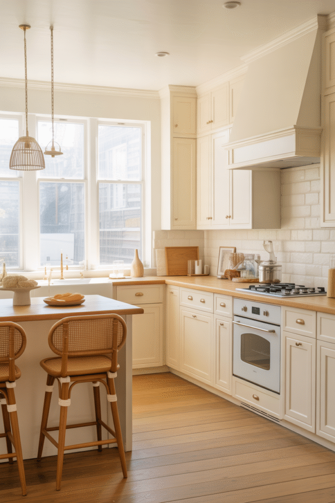 In the kitchen above, the cabinetry’s delicate ivory hue pairs perfectly with natural oak countertops and cane-backed barstools, balancing brightness with warmth. The subtle cream tone allows the texture of the wood and woven materials to stand out, while brass hardware and soft pendant lighting introduce a hint of polish. This palette invites you in — it’s welcoming, sunlit, and quietly luxurious.