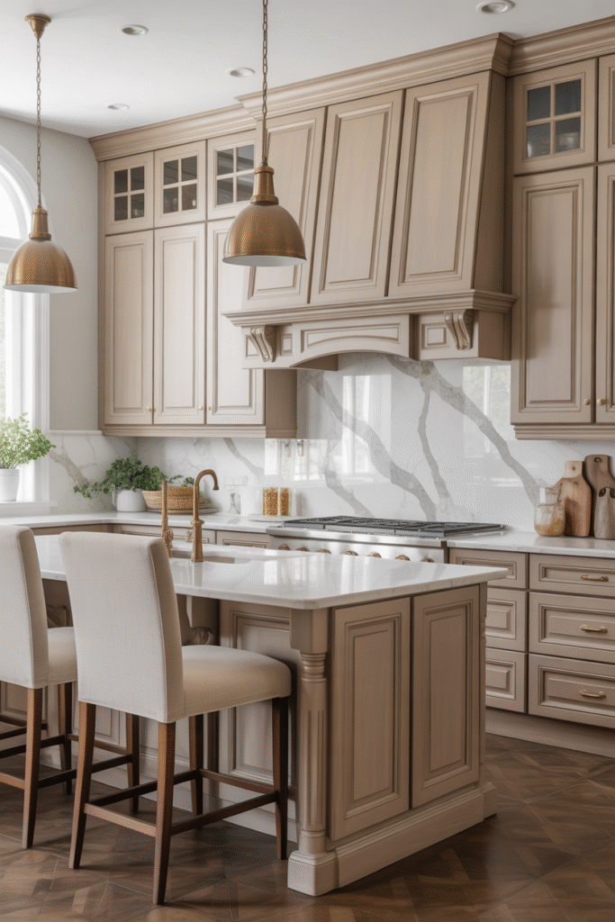In this kitchen, greige cabinetry adds a refined calm to the space. The marble backsplash introduces gentle movement, while the brass pendant lights lend warmth and visual weight. Together, they create a space that feels both classic and current — the sort of kitchen that ages gracefully as styles evolve.