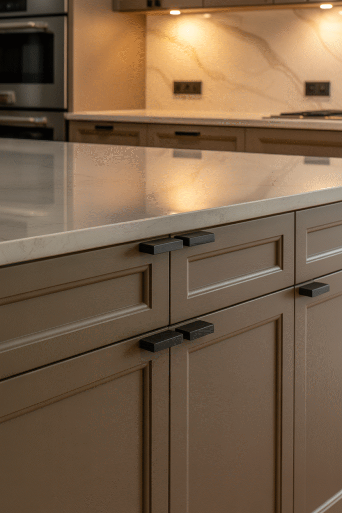 In this kitchen, the taupe finish introduces a gentle richness that plays beautifully against creamy marble countertops and subtle lighting. The matte black hardware adds contrast and definition, proving that warm neutrals can still make a statement. It’s the kind of kitchen that feels effortlessly elegant, whether it’s styled with sleek minimalism or layered with rustic texture.