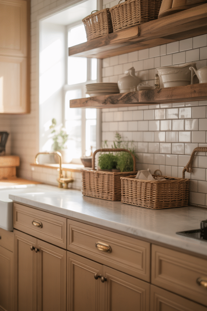 In this kitchen, the buttery beige cabinetry pairs beautifully with textured white subway tile and open wooden shelving, creating a balance between classic charm and everyday function. The woven baskets, brass hardware, and green herbs on the counter complete the picture: a space that feels both organized and warmly personal. This is a kitchen that says, “Stay awhile.”