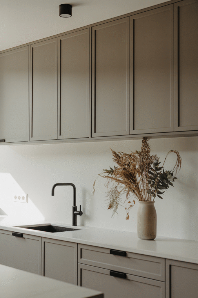 In this kitchen, the matte mushroom cabinetry exudes understated confidence. Paired with a crisp white countertop and matte black fixtures, it creates a modern yet inviting balance. The clean lines and minimalist styling allow the color itself to take center stage — a perfect match for those who love simplicity without sterility.