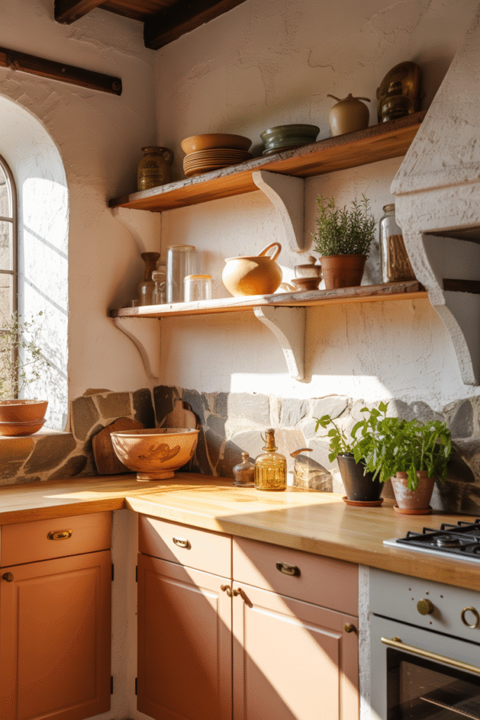 In this kitchen, the terracotta cabinetry radiates organic warmth beneath a soft golden light. The wooden countertops and open shelving echo the color’s earthy character, while stone accents and hand-thrown pottery add a tactile authenticity. Every detail contributes to a Mediterranean ease — relaxed yet full of personality.