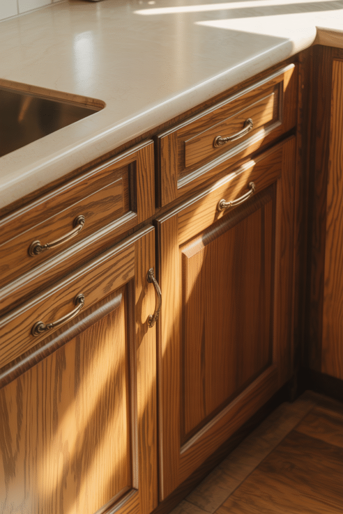 In this kitchen, the honey-toned oak cabinets gleam under natural light, their grain catching the sun in golden streaks. The soft cream countertops and vintage-style brass pulls lend an old-world charm that feels both inviting and timeless. This is the kind of kitchen that hums with quiet familiarity — where everything has a place, and mornings begin with warmth.