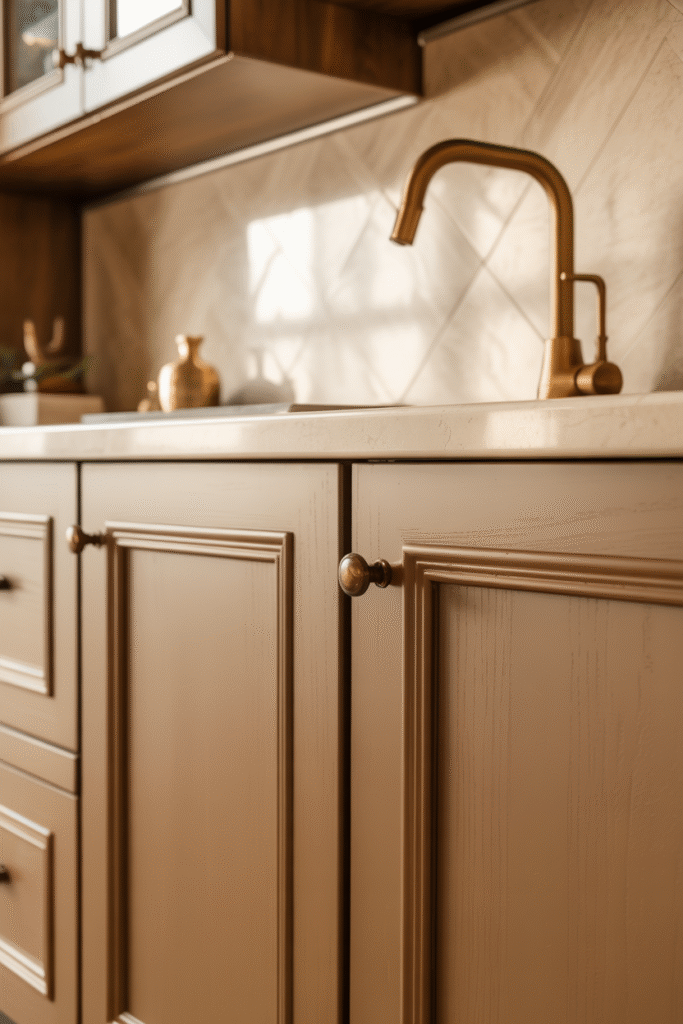 Here, the soft metallic faucet and vintage-style knobs echo the latte cabinetry’s undertones, creating a cohesive, monochromatic palette. The combination feels modern yet rooted — elegant enough for a designer home, but relaxed enough for daily life.