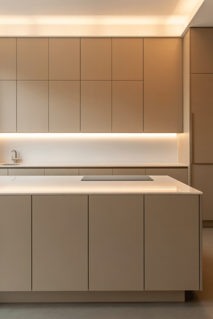 To make a putty-toned kitchen feel inviting rather than austere, play with lighting temperature — warm LED strips or pendant lights can add dimension and coziness. Pair it with natural textures like linen barstools or light wood flooring to soften the modern edges without losing that clean architectural feel.
