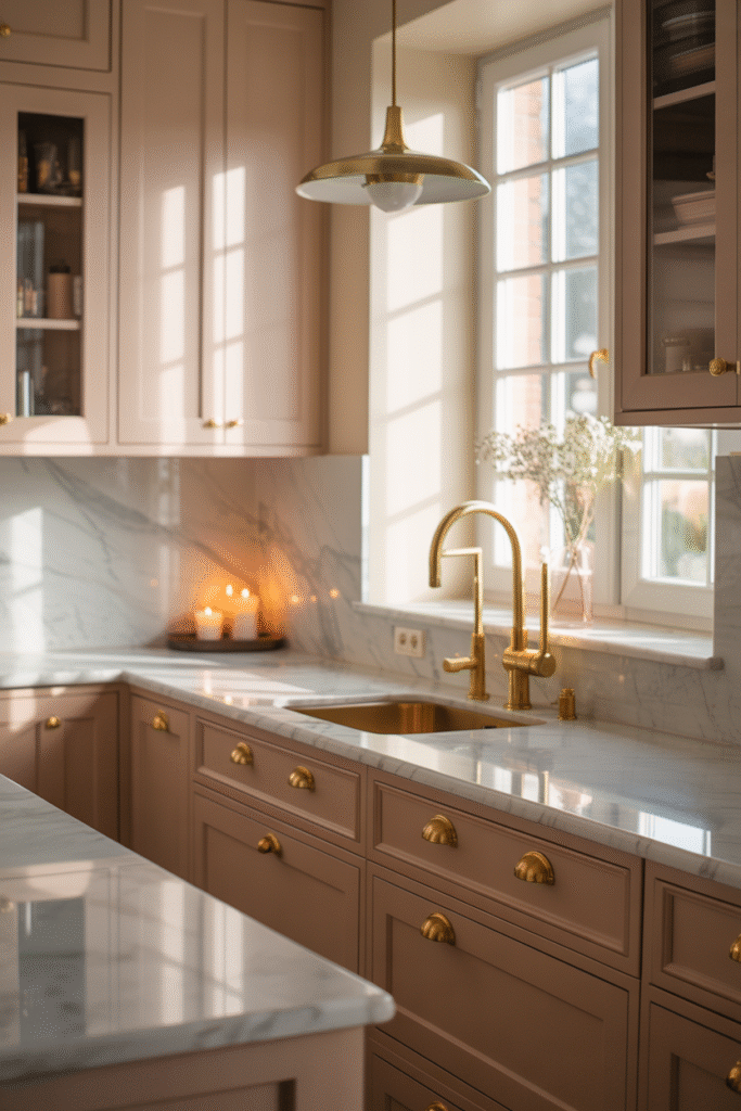 To make blush beige shine, pair it with warm metallics and natural light. A mix of matte and reflective surfaces — marble, satin brass, or glass — enhances its dimensionality. It’s also beautiful in candlelight, making it ideal for kitchens that double as cozy entertaining spaces.