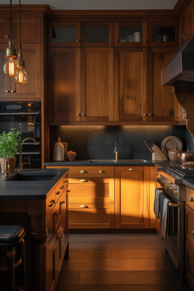 To modernize caramel or maple cabinetry, introduce matte finishes and sleek black or brass fixtures for contrast. Pair with stone or concrete countertops to balance the warmth with a touch of contemporary cool. And don’t underestimate lighting — ambient, low-temperature bulbs can make the wood’s tone glow like sunset.