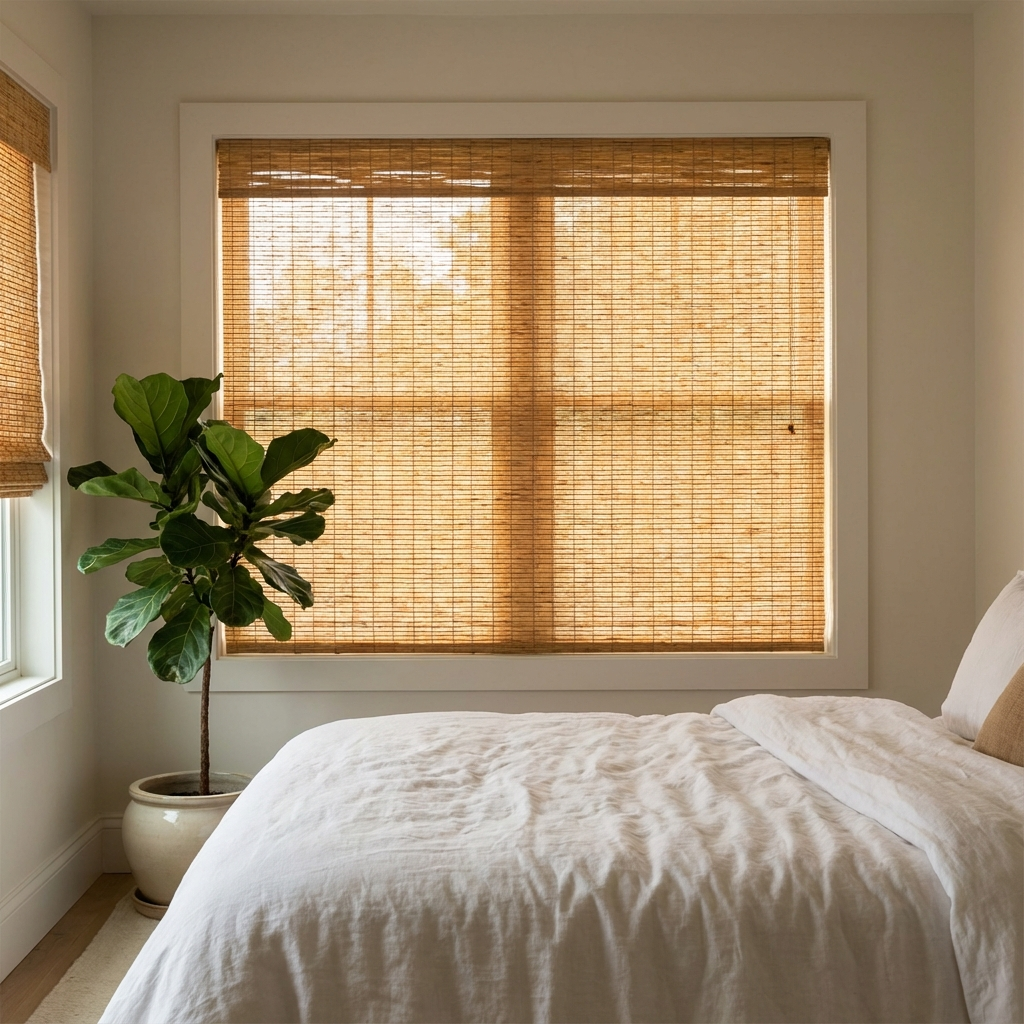 Woven wood shades, often made from bamboo, grasses, or jute, introduce organic texture and warmth to a bedroom. This treatment works exceptionally well in neutral or monochromatic color schemes, preventing the space from feeling sterile. While they naturally filter light rather than block it, they can be customized with privacy or blackout liners to suit bedroom requirements. Their natural variation in color allows them to coordinate with various wood tones in furniture and flooring.