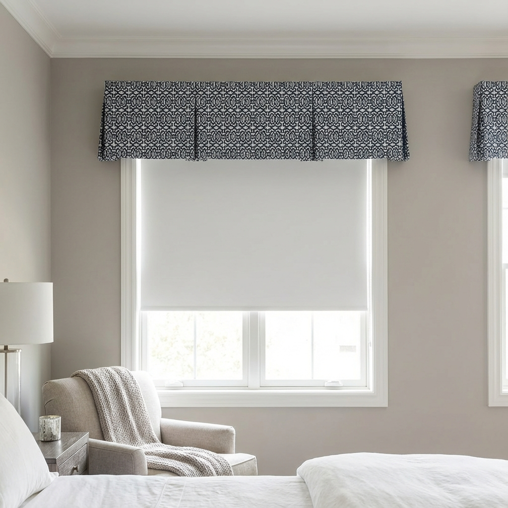 For budget-conscious updates or small windows where full drapes feel overwhelming, a patterned valance adds a pop of color and softness without the cost of substantial yardage. Valances cover only the top portion of the window, concealing drapery hardware and softening the upper frame. In bedrooms, these are best paired with a secondary functional layer, like a roller shade or blinds, to handle privacy needs.