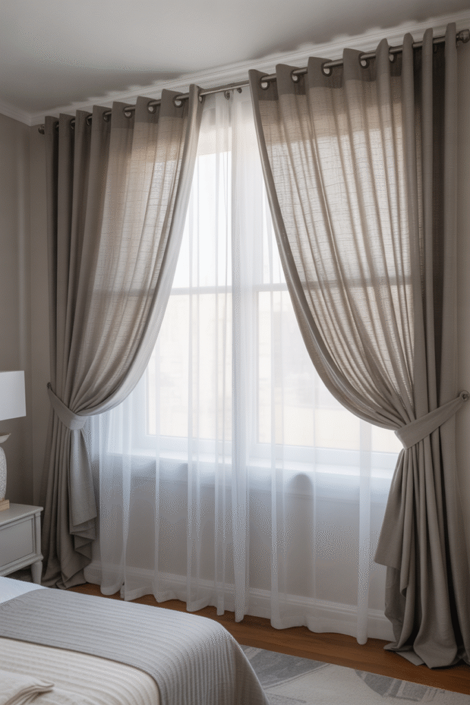 The classic combination is sheer curtains closest to the window with heavier drapes on the outer layer. During the day, pull back the drapes and let the sheers filter light gently. At night, close everything for complete privacy and darkness.