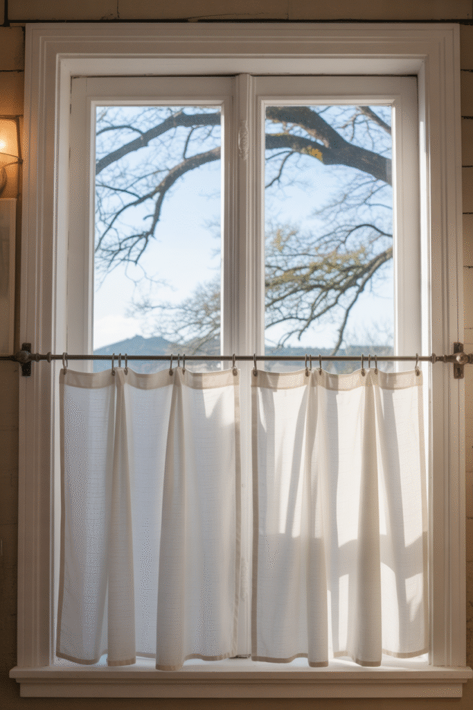 For bedrooms, choose café curtains in slightly more substantial fabrics than you’d use in a kitchen. Linen, cotton, or even lightweight wool keeps them from feeling too casual. You can also layer café curtains with a top treatment like a valance for a complete look.