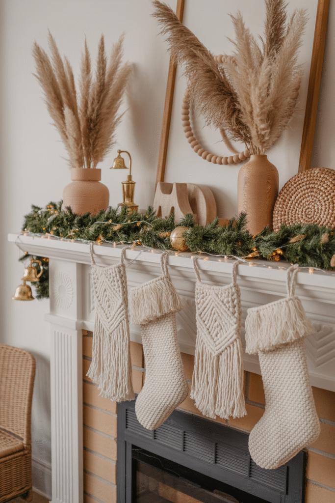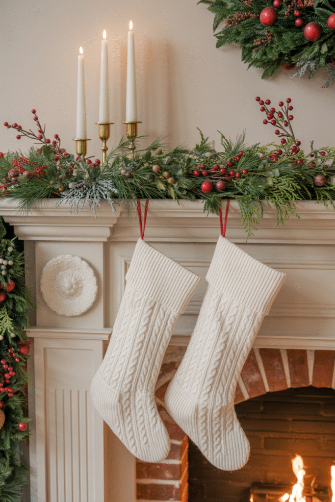 Start with a lush cedar or pine garland and weave in red berry sprigs and gold ribbon. Hang cream or white knit stockings to keep it elegant, not overwhelming.