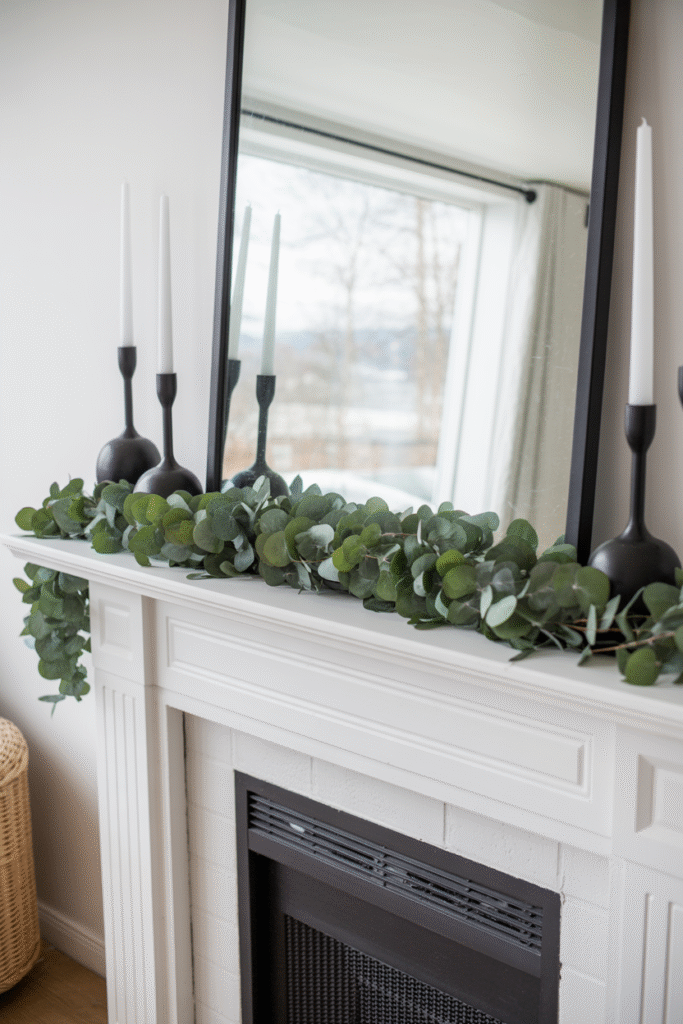 Choose a sleek eucalyptus garland or a single strand of greenery, then add sculptural accents like black metal candleholders or matte ceramic vases.