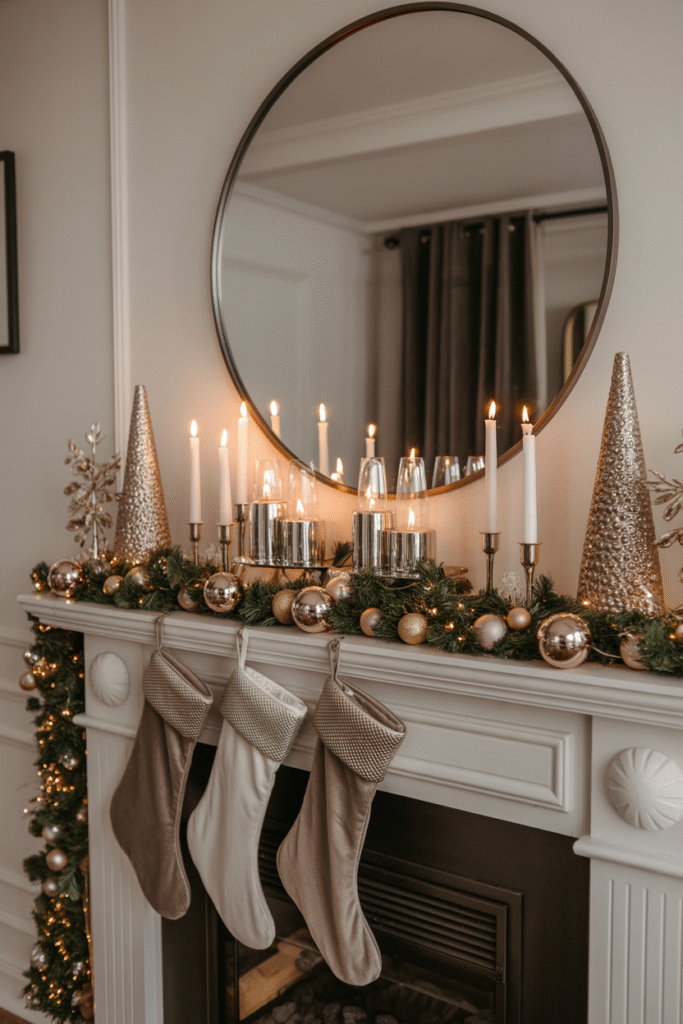 Add height with taper candles in brass holders and scatter a few shiny ornaments for that nostalgic sparkle. This look works beautifully with wood mantels, brick fireplaces, or any home that loves tradition with a twist.