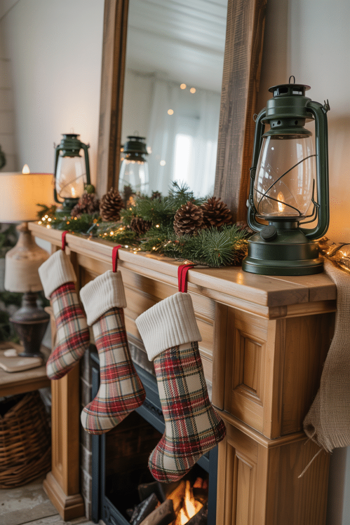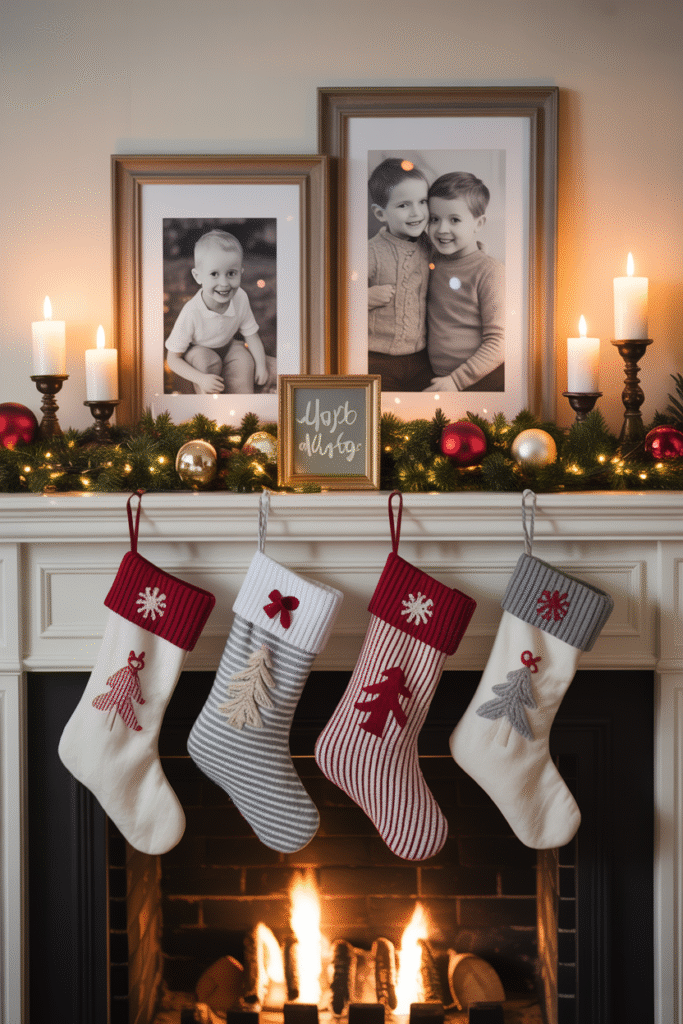Hang mismatched stockings to represent each person. Add framed holiday cards or heirloom decor pieces for nostalgia.