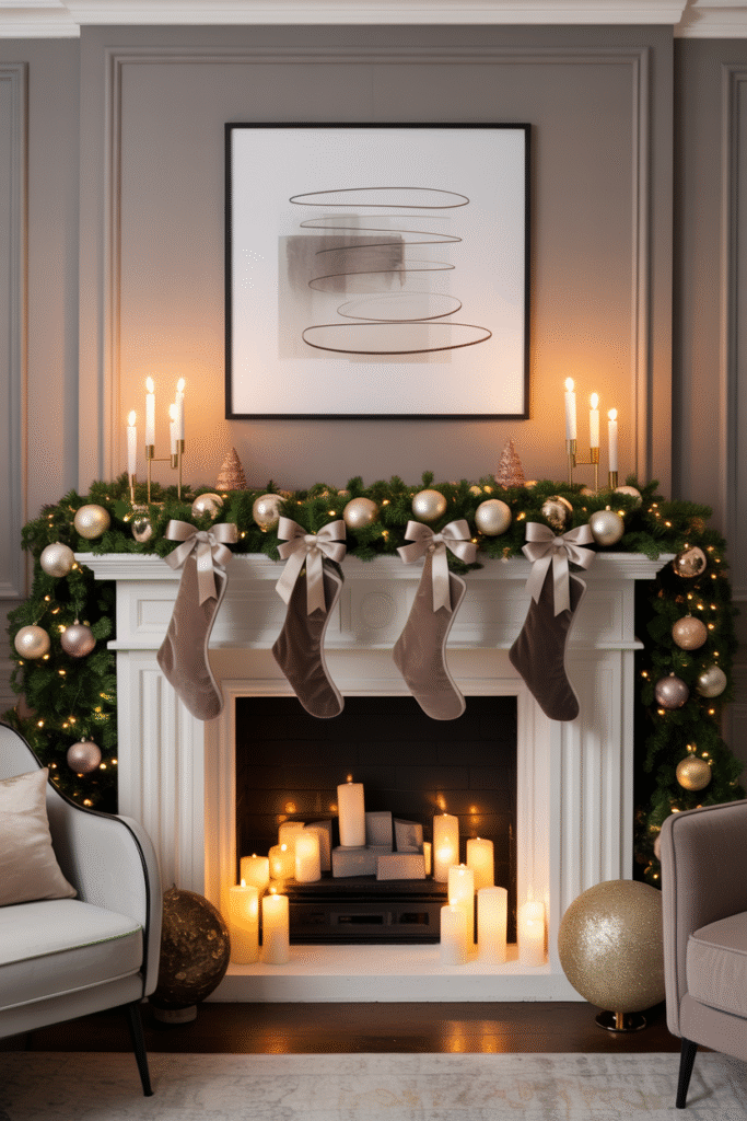 - Layer heights — candles, garland, and stockings should create natural movement.
