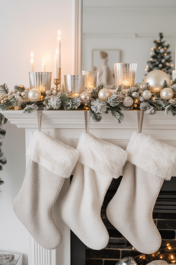 Keep textures soft — faux fur stockings, silk ribbons, and satin bows. It feels like a snowy morning without ever leaving the warmth of your home.