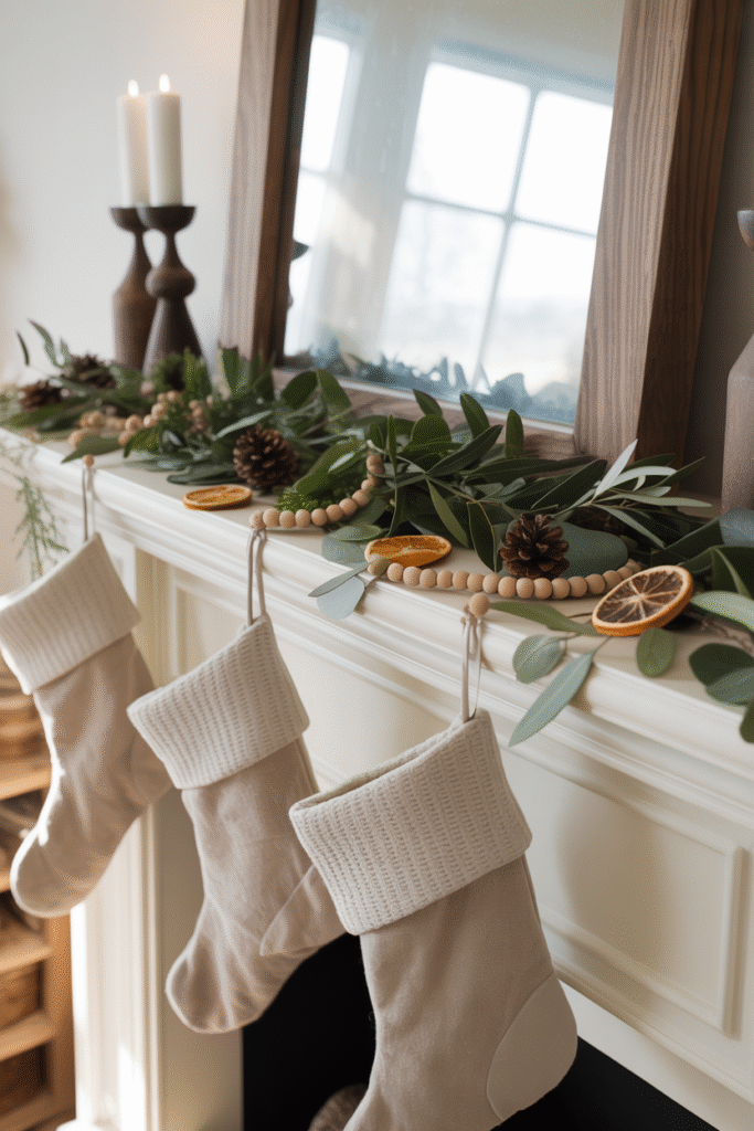 Use real greenery (cedar, eucalyptus, olive branches) combined with dried orange slices and wooden bead garlands.