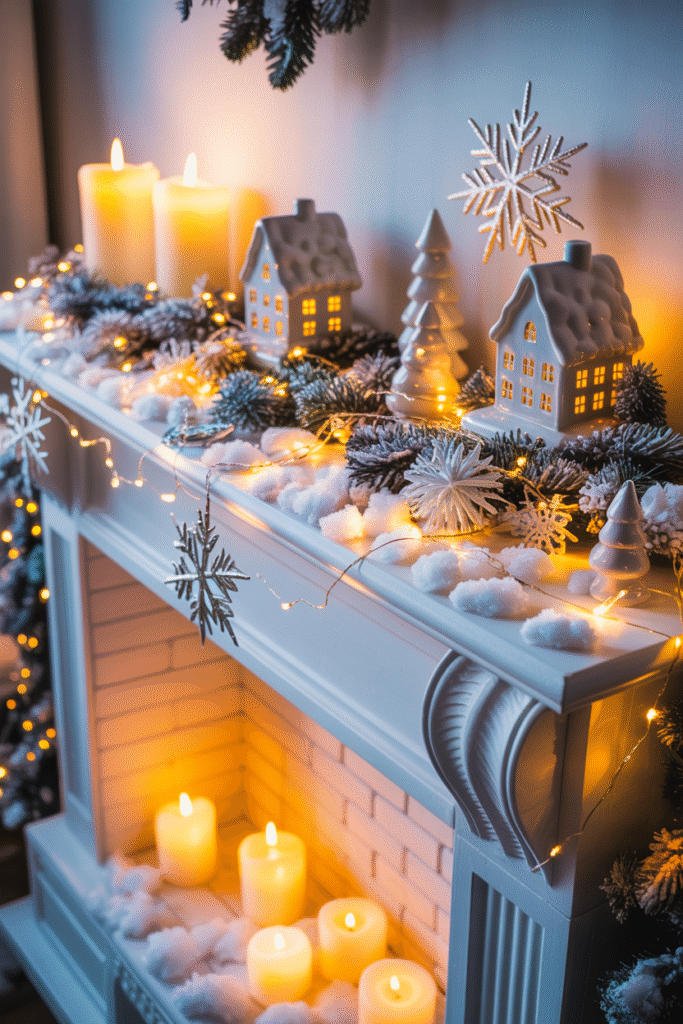 Layer snow-flecked garlands, sparkling ornaments, and tiny fairy lights for that frosted glow.