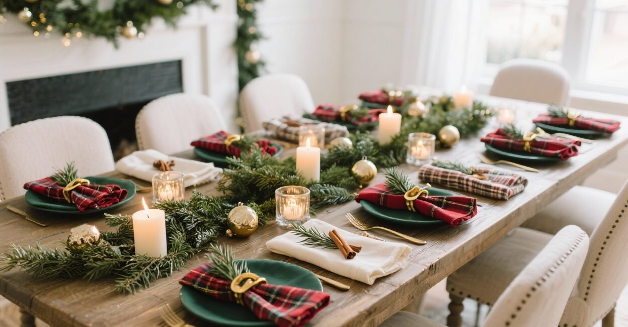 - Mix patterns thoughtfully: tartan napkins + solid runners keep it from going too busy.