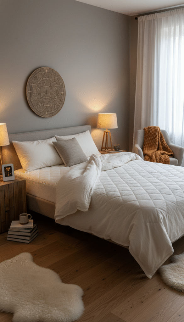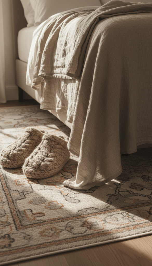 The transition from warm bed to cold floor is the worst part of the morning. Placing a genuine or high-quality faux sheepskin rug right where your feet land makes waking up gentler. The dense pile offers immediate warmth and cushioning. It adds a layer of organic texture that softens the hard lines of bedroom furniture.