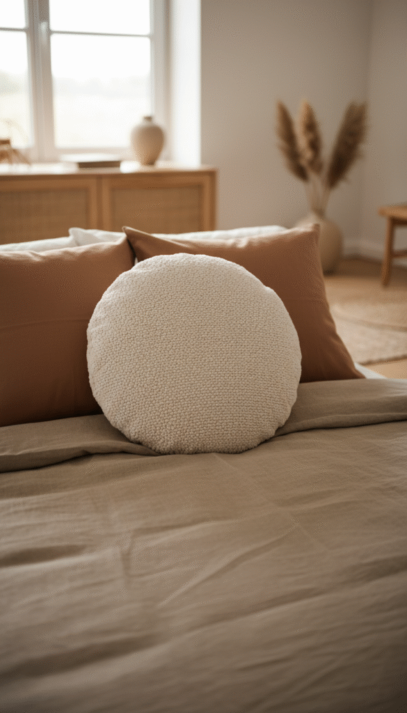 Bouclé fabric features looped yarn that creates a nubby, teddy-bear-like texture. Adding a few bouclé throw pillows instantly warms up the visual landscape of the bedroom. The fabric is durable and resistant to matting, keeping its unique look over time. It pairs beautifully with smoother fabrics like linen or cotton percale.